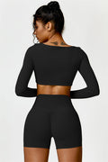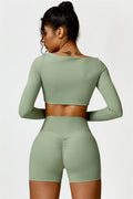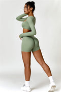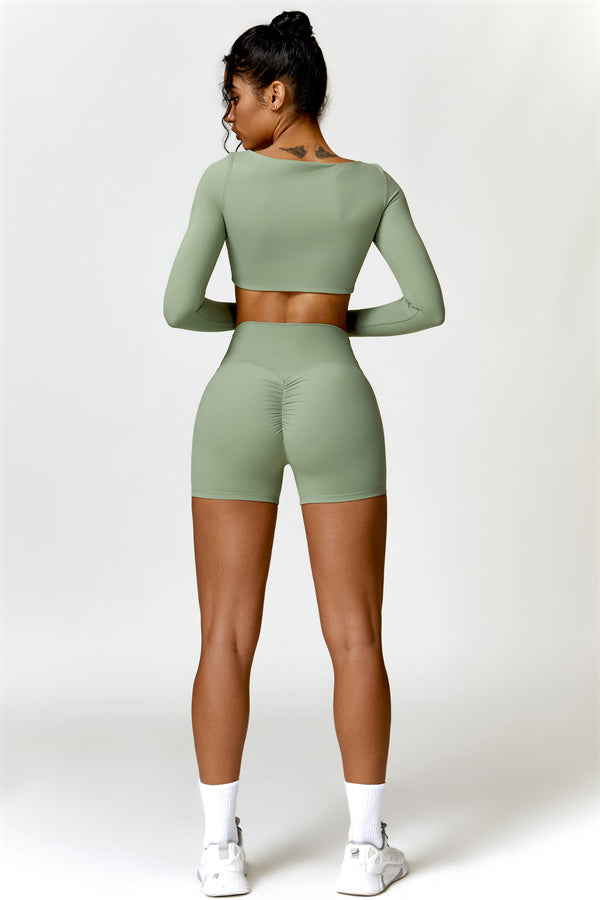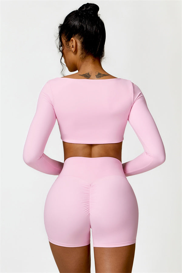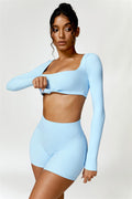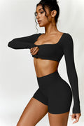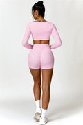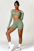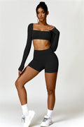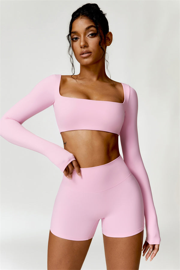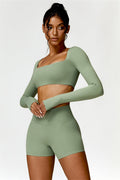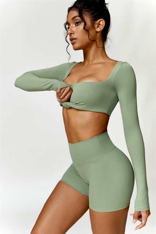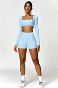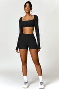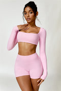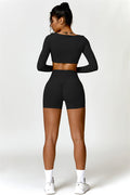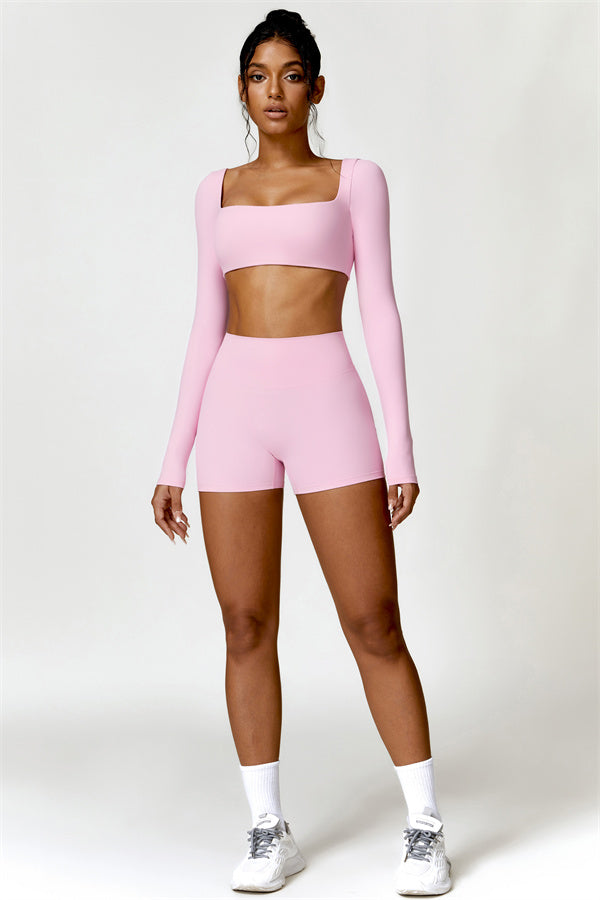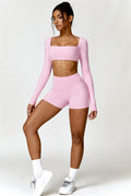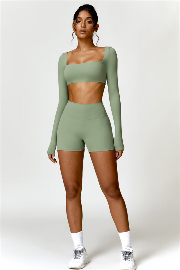 Enhance your workout wardrobe with this elegant matching set, featuring a long-sleeve top and shorts that combine comfort, style, and functionality. The top is designed with a square neckline, showcasing your collarbone for a flattering, feminine touch. Paired with high-rise shorts that emphasize a rounded, full silhouette thanks to contouring seams, this set highlights your shape effortlessly.