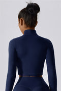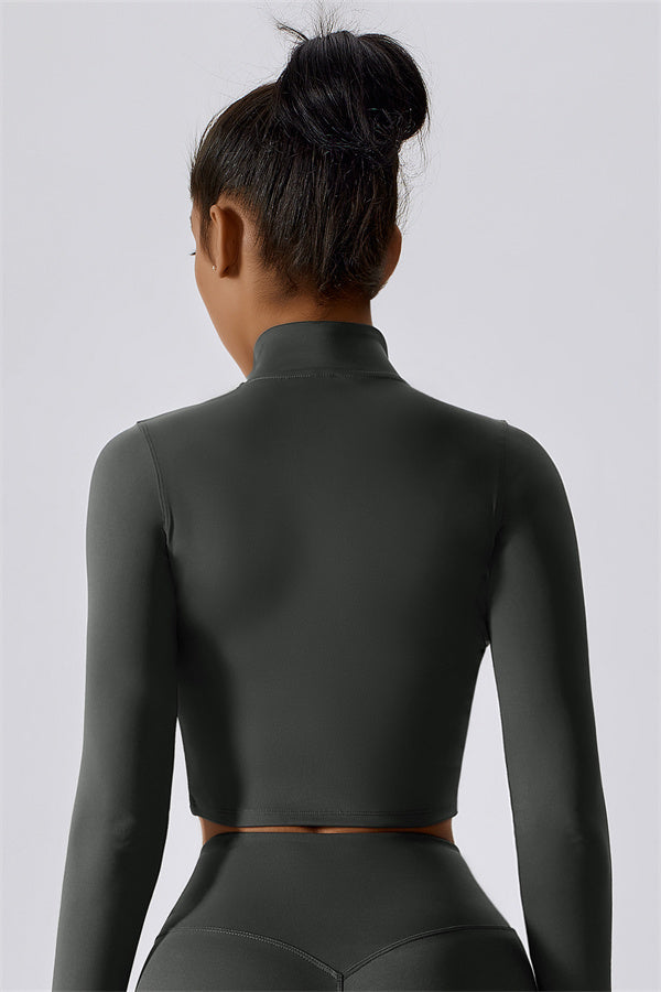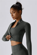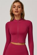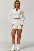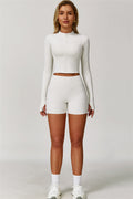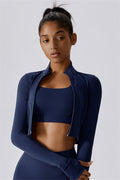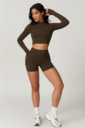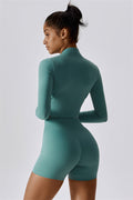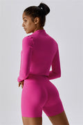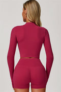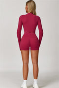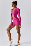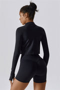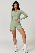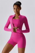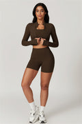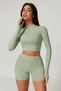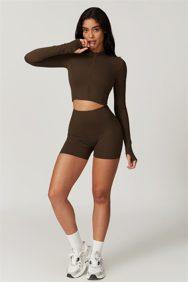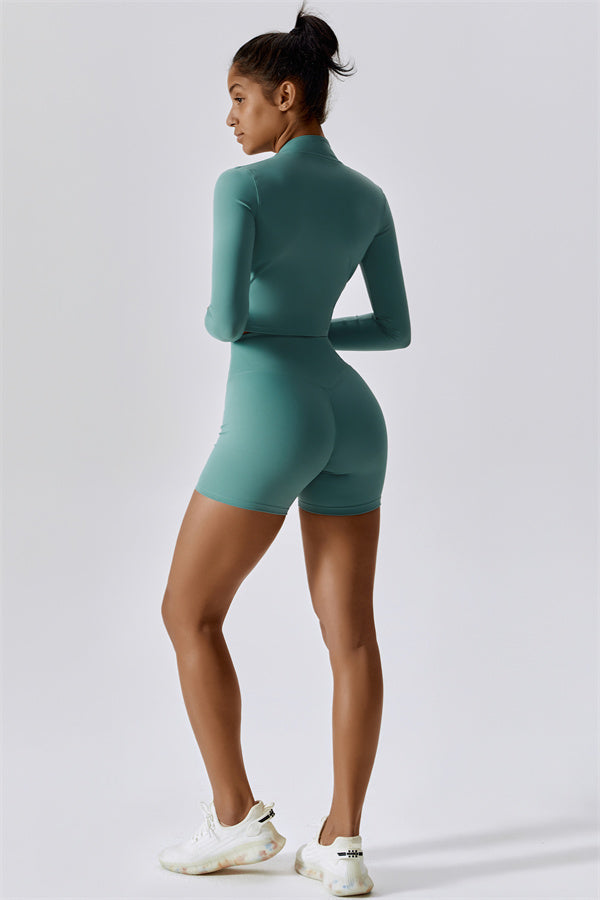 This stylish matching set includes a jacket, sports bra, and shorts, designed to offer both comfort and performance. The jacket features a modern high collar with a full zipper, giving you the flexibility to adjust your look and stay cozy during workouts or casual outings. The wide crisscross straps on the back highlight your shoulders and create a flattering silhouette. Its curved structure on the front accentuates your figure, while the pleated details on the back shape and enhance your curves.