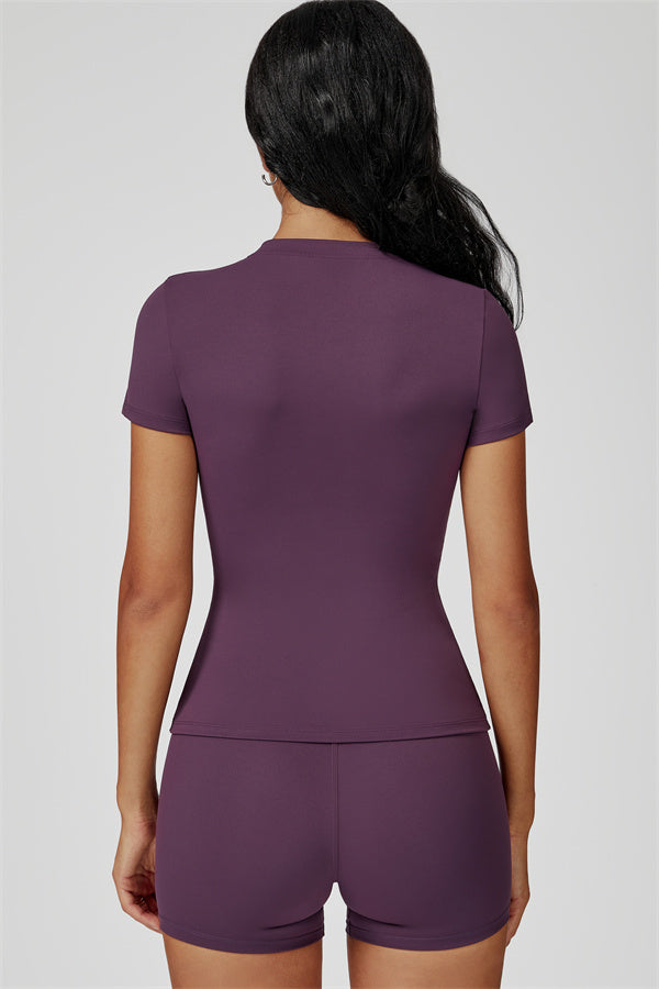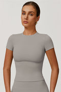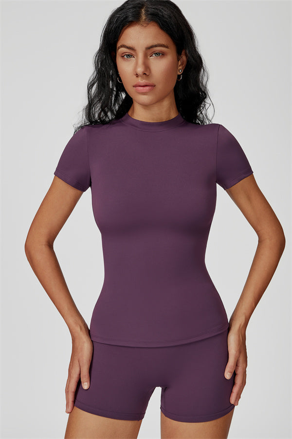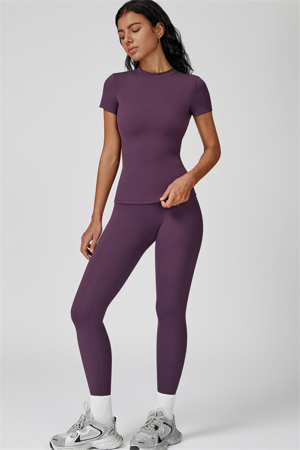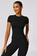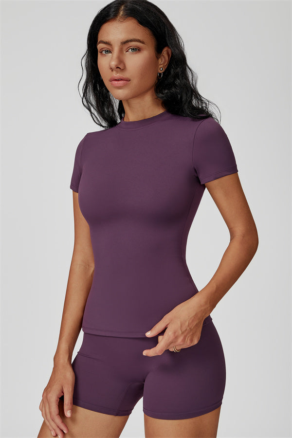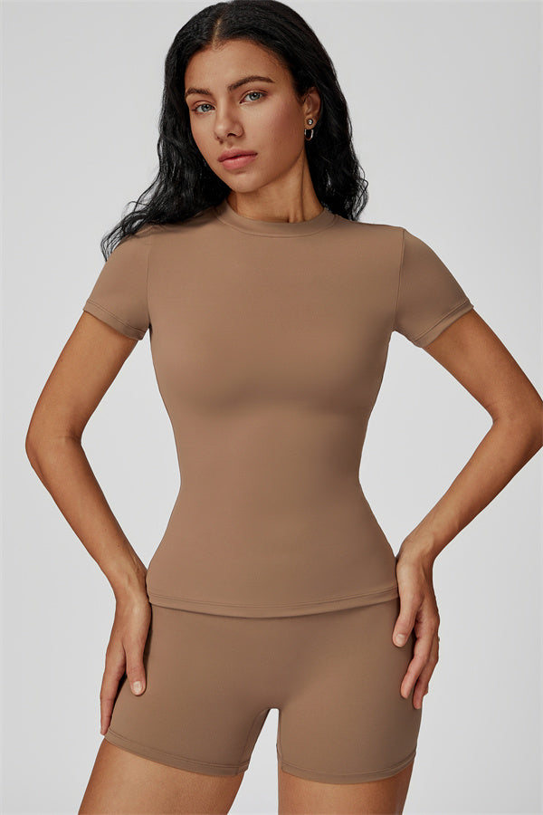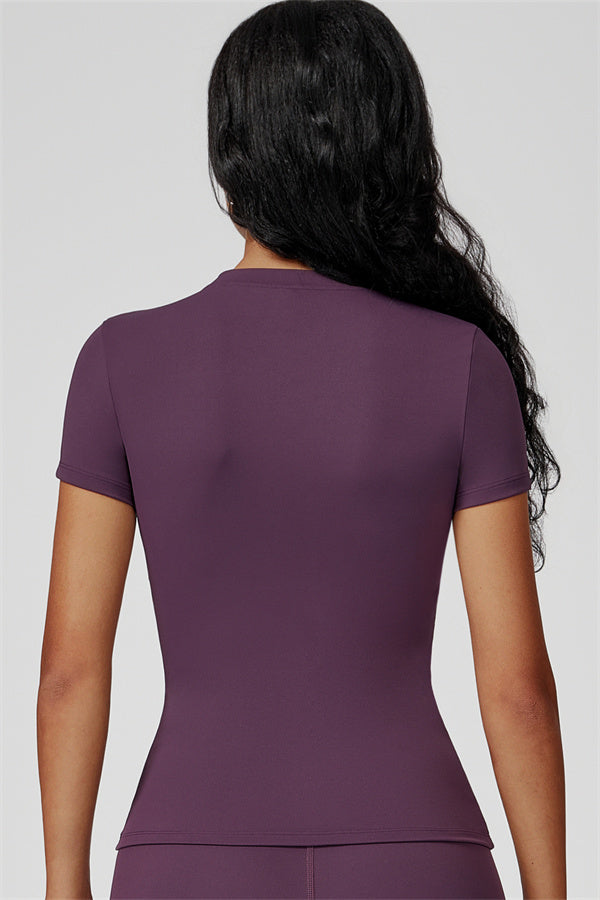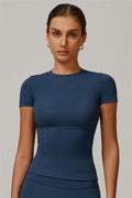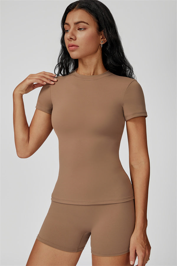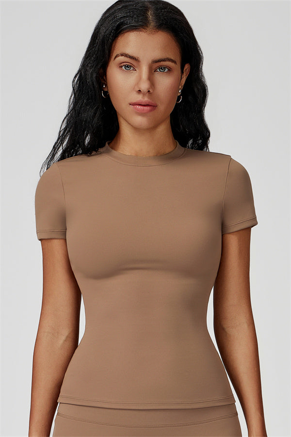Achieve effortless style and comfort with this classic T-shirt, perfect for workouts or casual wear. The timeless round neckline highlights your natural shape, creating a flattering and sculpted look. Designed with a slim-fit silhouette and extended hem, it hugs your body for a secure and supportive feel.