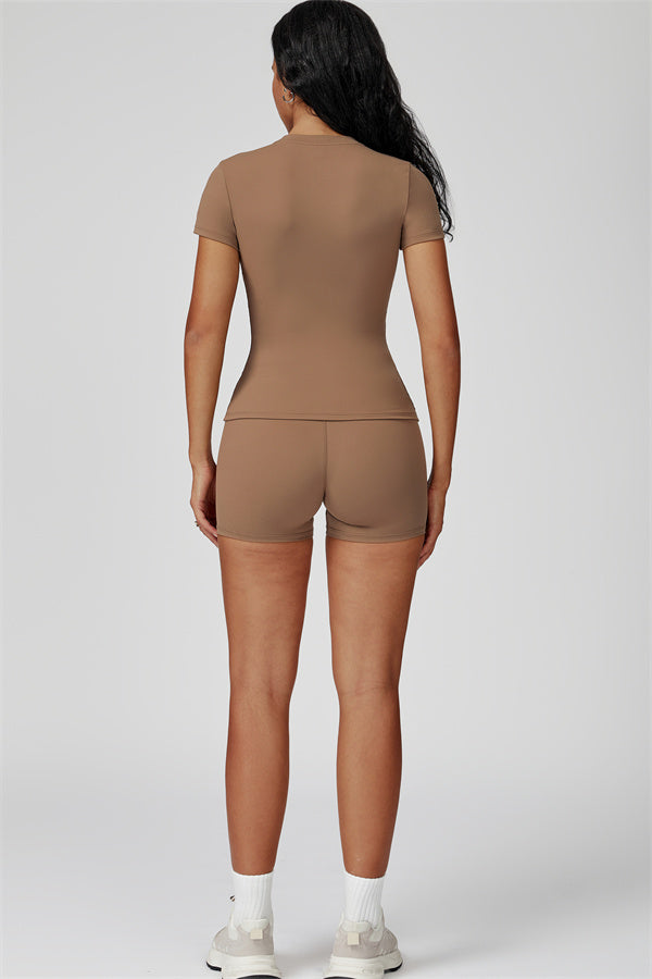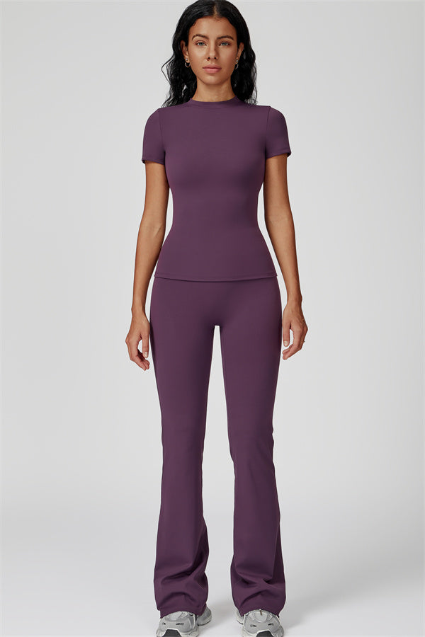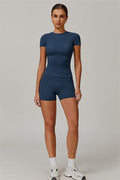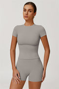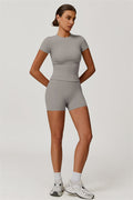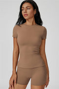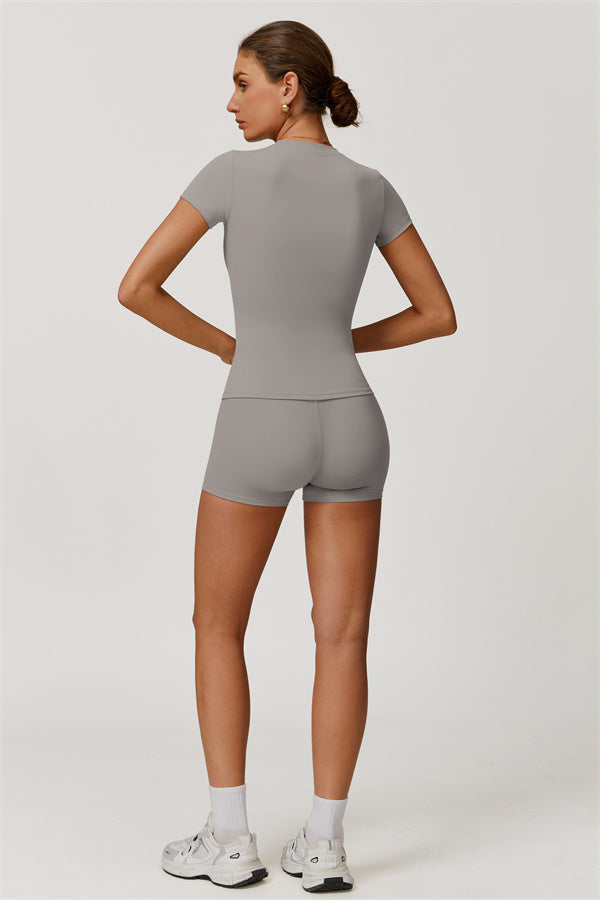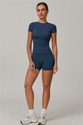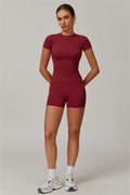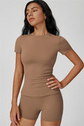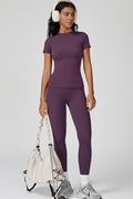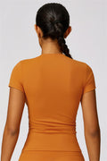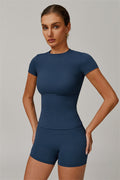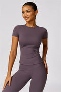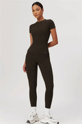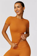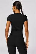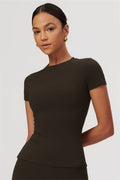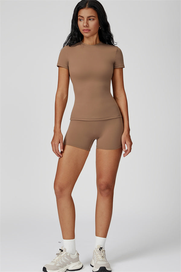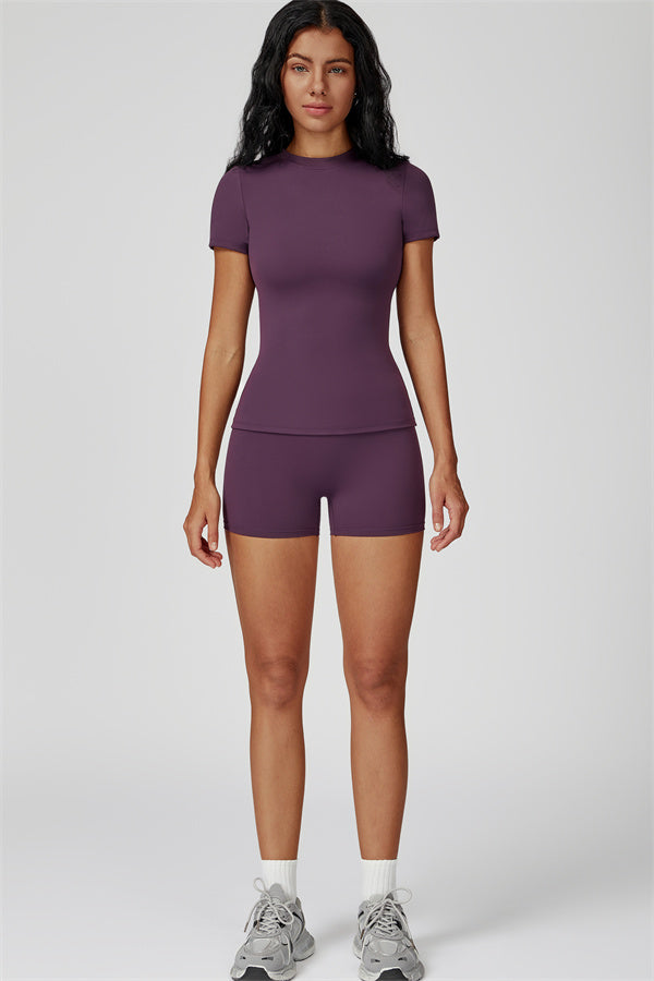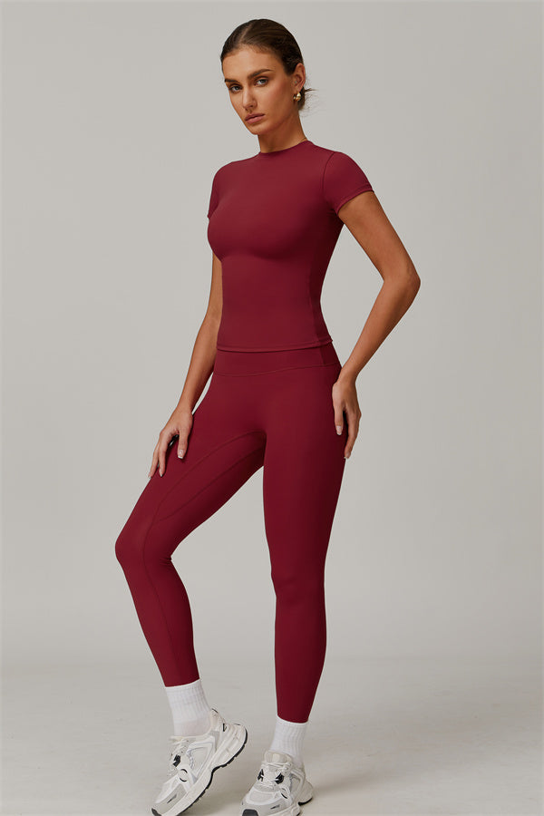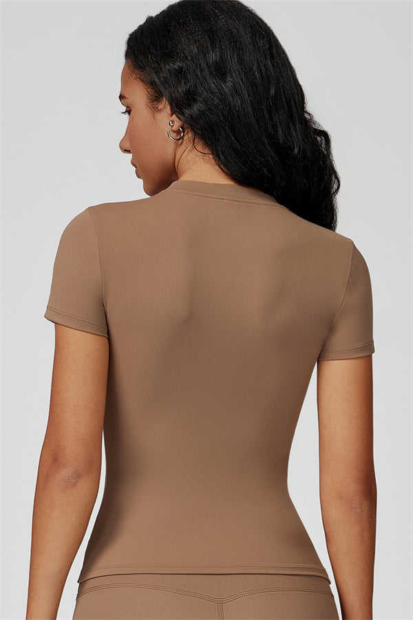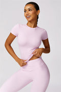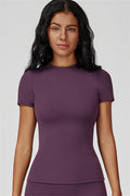 Achieve effortless style and comfort with this classic T-shirt, perfect for workouts or casual wear. The timeless round neckline highlights your natural shape, creating a flattering and sculpted look. Designed with a slim-fit silhouette and extended hem, it hugs your body for a secure and supportive feel.