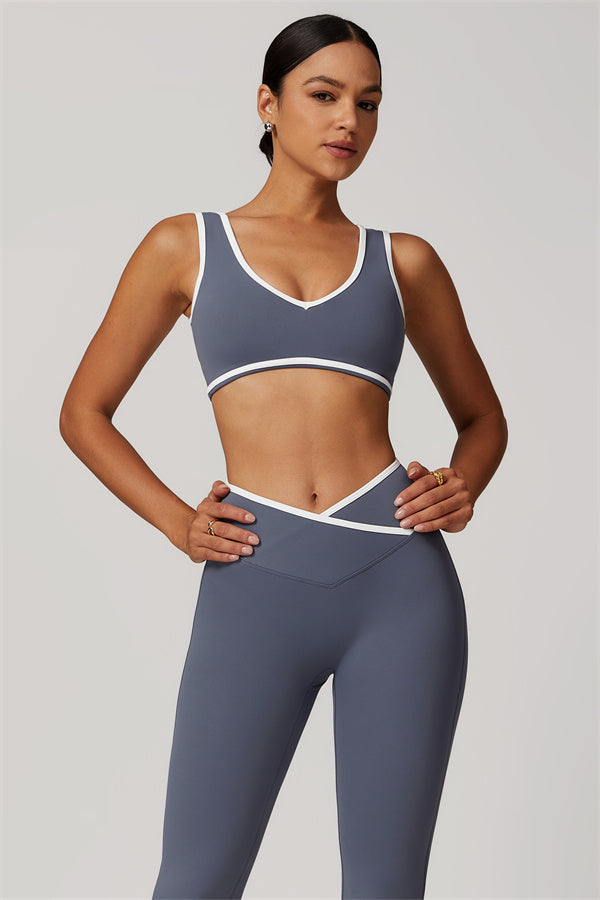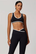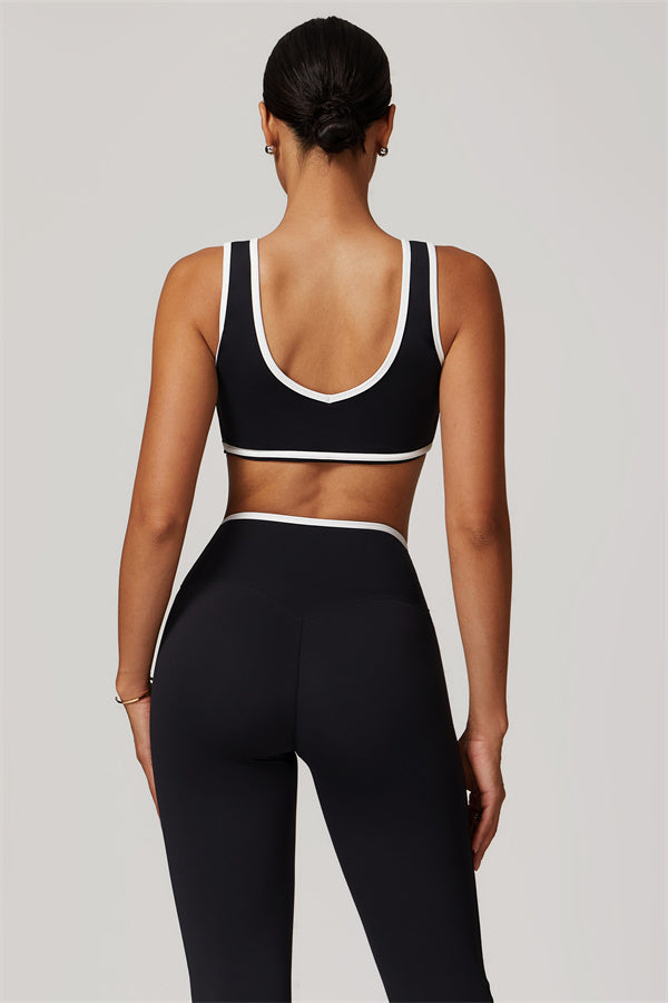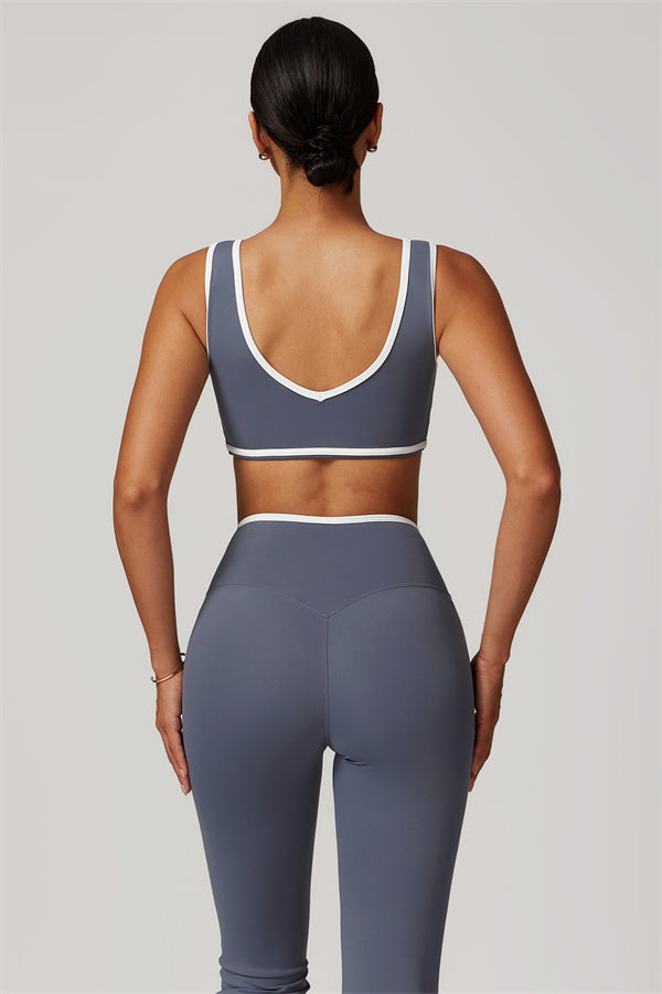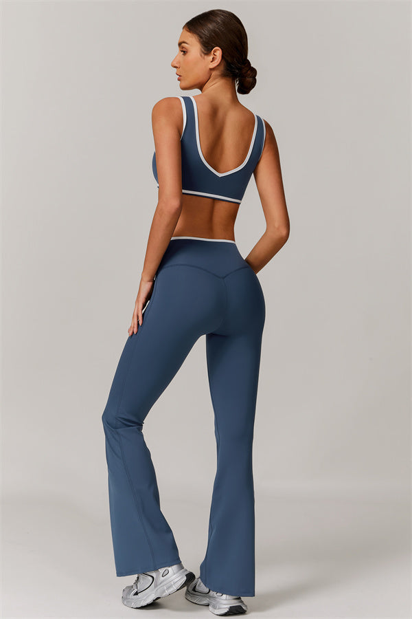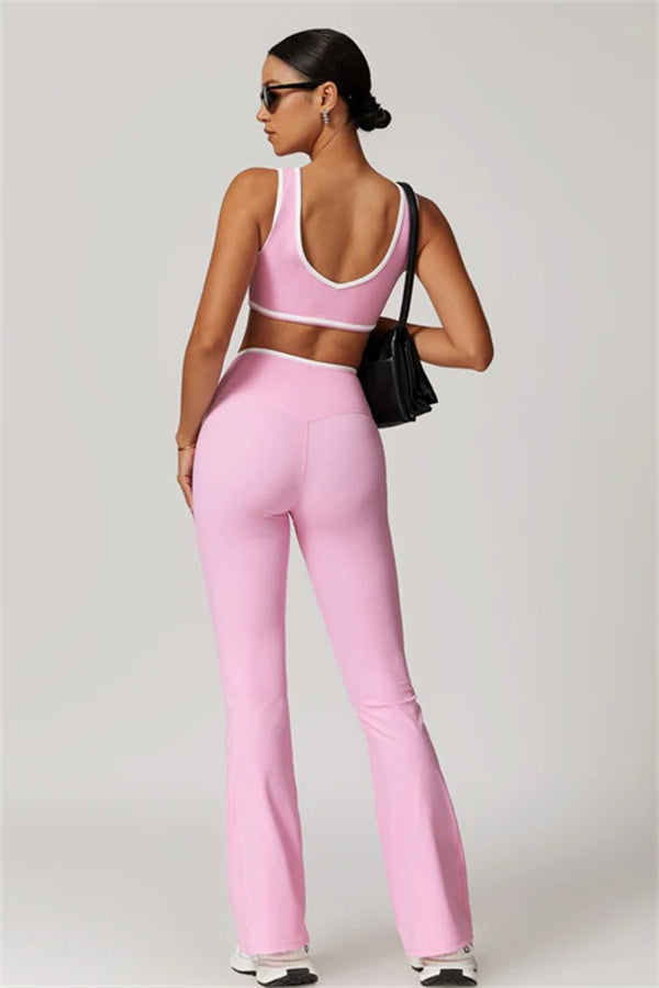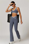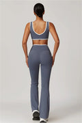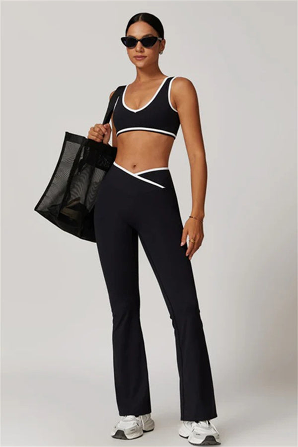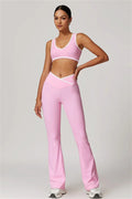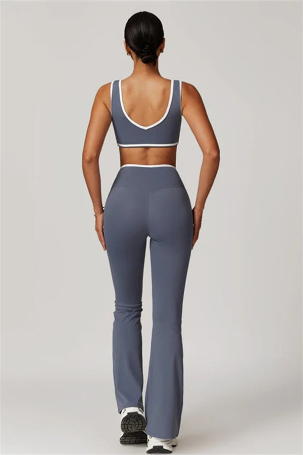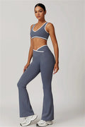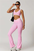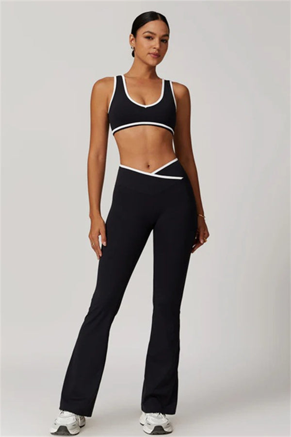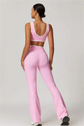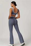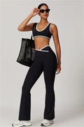 Elevate your activewear style with this sleek and feminine matching set, featuring a flattering sports bra and elegant flared leggings. Designed for movement and allure, this set blends functionality with confidence-boosting details.