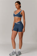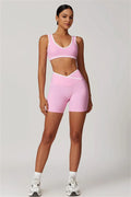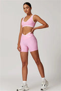 Infuse your activewear collection with style and versatility with this vibrant matching set, featuring a sports bra and shorts designed to flatter and perform. Perfect for workouts or casual outings, this set combines a chic design with superior comfort.